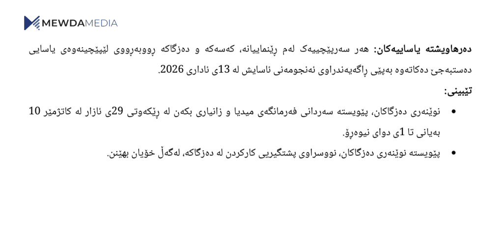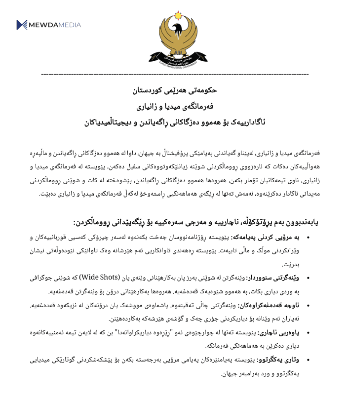 ئاماژەی بۆ ئەوەشکرد “داوا لە سەرجەم دەزگاکانی راگەیاندن و ماڵپەڕە هەواڵییەکان دەکەن کە دەیانەوێت رووماڵی مەیدانی ئەو شوێنانە بکەن، پابەندی رێنوێنییەکان بن: