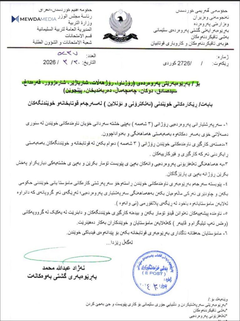 ئاماژەی بۆ ئەوەشکرد “دەستەی کارگێڕیی ناوەندەکانی خوێندن پابەند دەکرێن بە دەوامکردن لە رۆژانی سێشەممە، ئەمەش لەپێناو راییکردنی ئەرکە کارگێڕیی و فێرکارییەکان”.