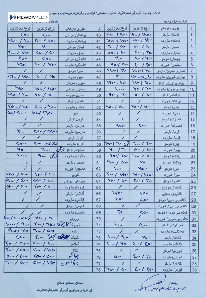 بهپێى ئهو نرخانهى كه رۆژانه له لایهن كشتوكاڵى پارێزگاى سلێمانى له عهلوهى سلێمانى وهردهگیرێن، ئهمڕۆ دووشهممه، نرخى یهك كیلۆ تهماتهى ناوخۆ به 2000 بۆ 2100 دینار بووه، ئهو نرخهى عهلوه جیاوازه له نرخى دهرهوه، بهو پێیه نرخى یهك كیلۆ تهماتهى ناوخۆ له دهرهوهى عهلوه به 2250 دینار بۆ 2500 دینار دهست هاوڵاتیی دهكهوێت.