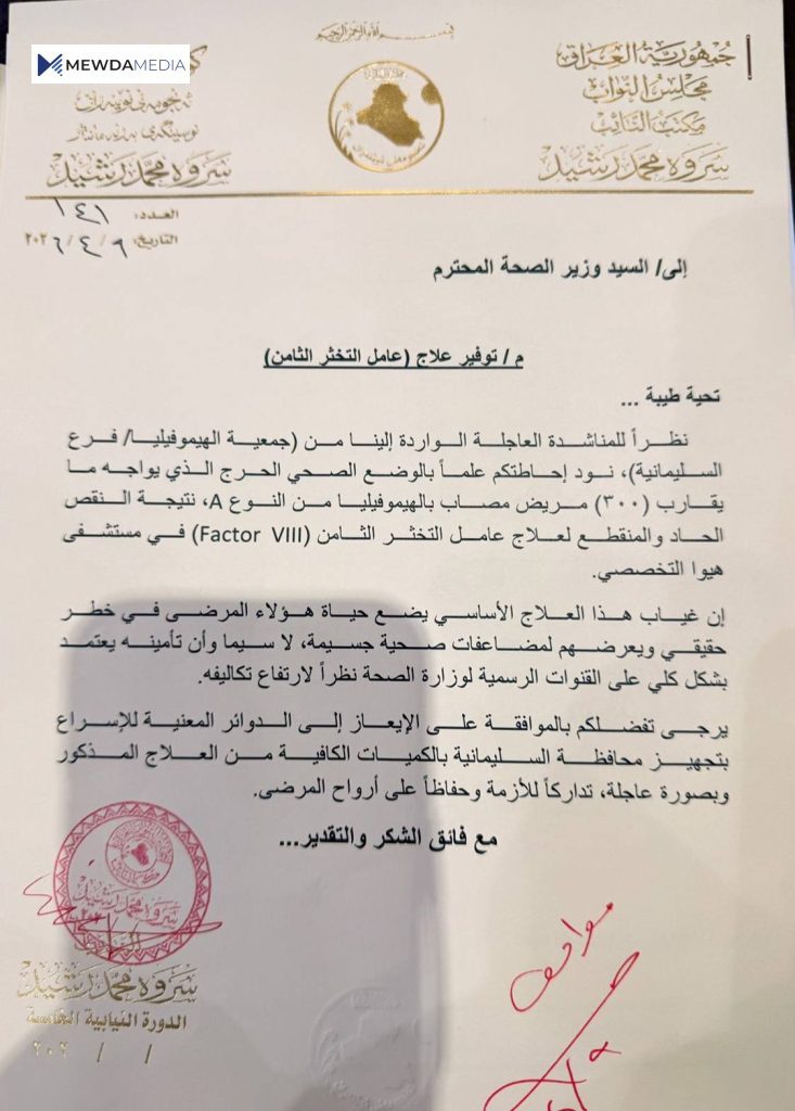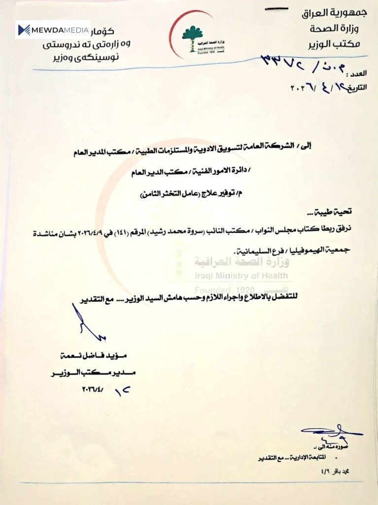 ئاماژەی بۆ ئەوەشکرد “وەزارەتی تەندروستی عیراق لەسەر داواکارییەکەی ئەوان هەڵدەستێت بە دابینکردنی دەرمان و پێداویستی پزیشکی بۆ ( 300) نەخۆشی ( هیمۆفیلیا ) ئەوانەی کەوا کێشەی خوێنیان هەیە لە پارێزگای سلێمانی”.