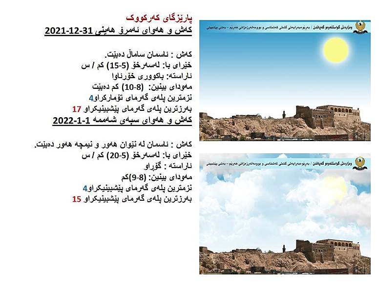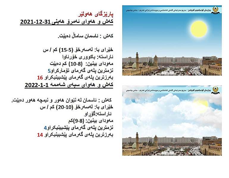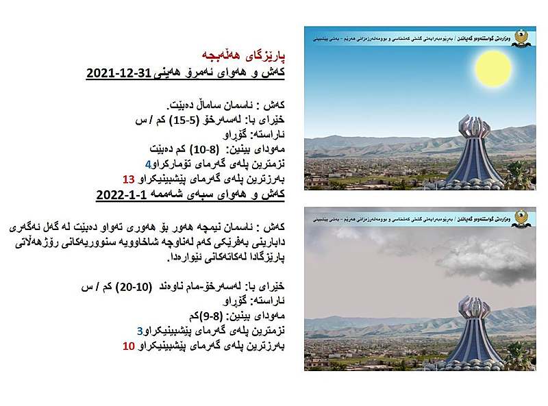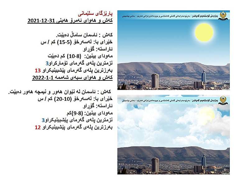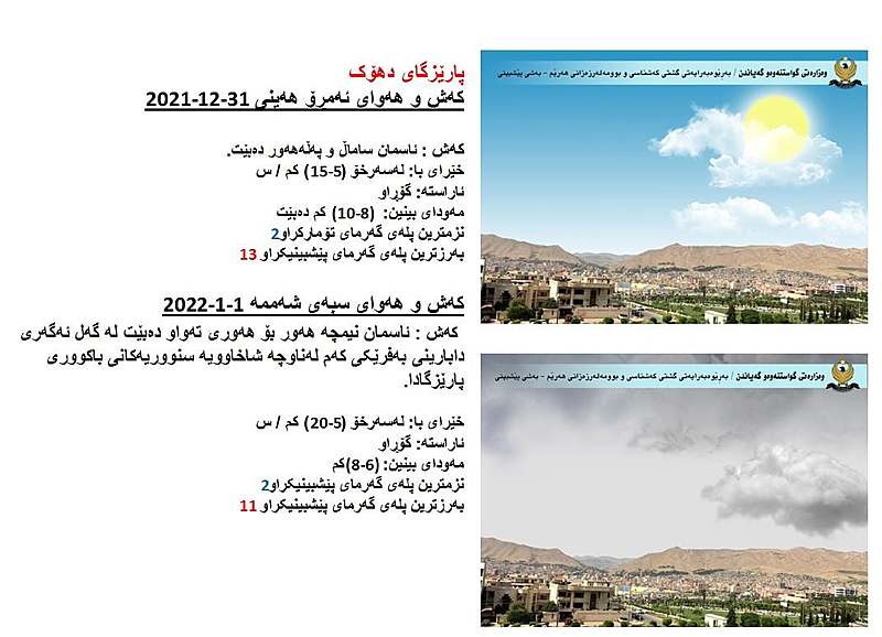 ئەمڕۆ پێنجشەممە 30ی کانوونی یەکەمی 2021 لە راگەیەندراوێکدا بەرێوەبەرایەتیی گشتیی کەشناسی و بومەلەرزەزانی هەرێمی کوردستان ئاماژەی بەوەکرد "لە 48 کاتژمێری داهاتوودا ئاسمان نیمچە هەور بۆ هەوری تەواو دەبێت لەگەڵ دابارینی بەفرێکی کەم لە ناوچە شاخاوییە سنوورییەکان".