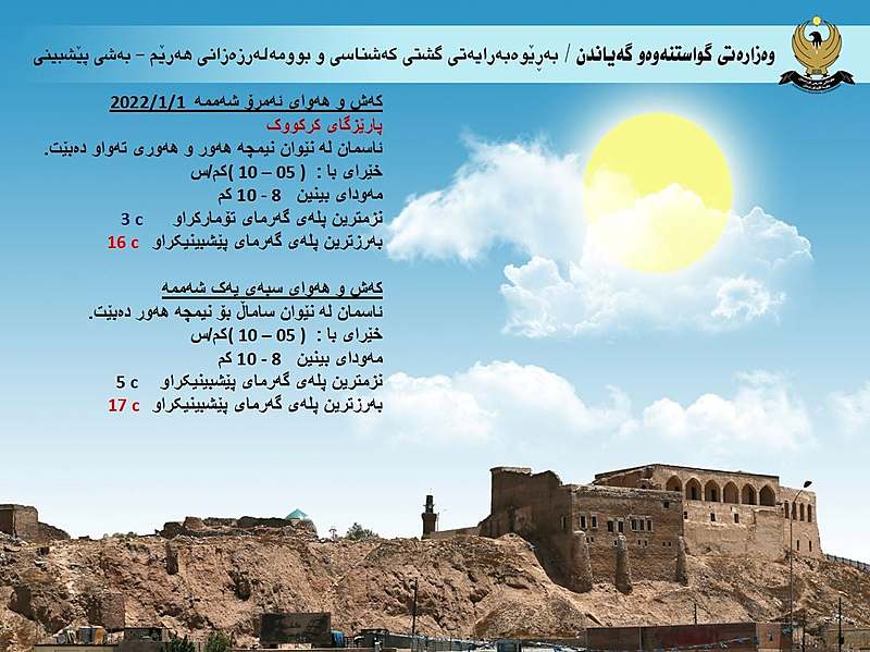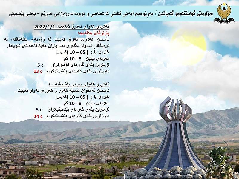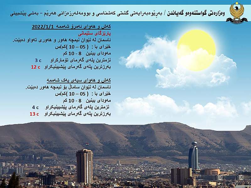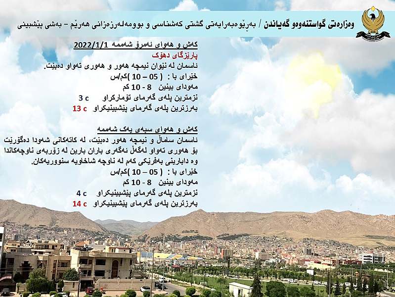 ئەمڕۆ شەممە یەکی کانوونی دووەی 2021 لە راگەیەندراوێکدا بەرێوەبەرایەتیی گشتیی کەشناسی و بومەلەرزەزانی هەرێمی کوردستان ئاماژەی بەوەکرد "لە 48 کاتژمێری داهاتوودا ئاسمان نیمچە هەور بۆ هەوری تەواو دەبێت لەگەڵ دابارینی بەفرێکی کەم لە ناوچە شاخاوییە سنوورییەکان".