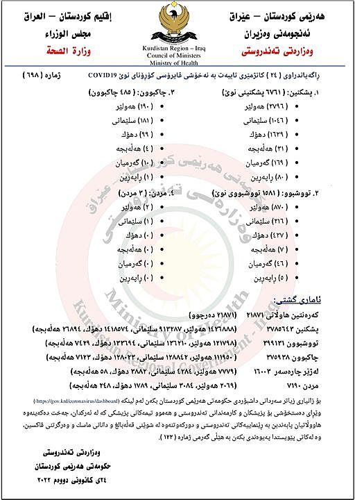 ئەمڕۆ دووشەممە 24ی کانونی دووەمی 2022 وەزارەتی تەندروستیی هەرێمی کوردستان رایگەیاند، لە 24 کاتژمێری رابردوودا 1581 تووشبووی نوێ تۆمارکراون و 3 تووشبووش گیانیان لەدەستداوە, هاوکات ئاماژەی بۆ ئەوەشكردووە، لە 24 کاتژمێری رابردوودا 485 تووشبووی كۆرۆنا چاكبوونهتهوه.