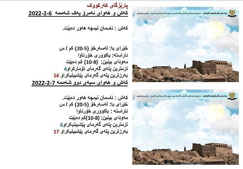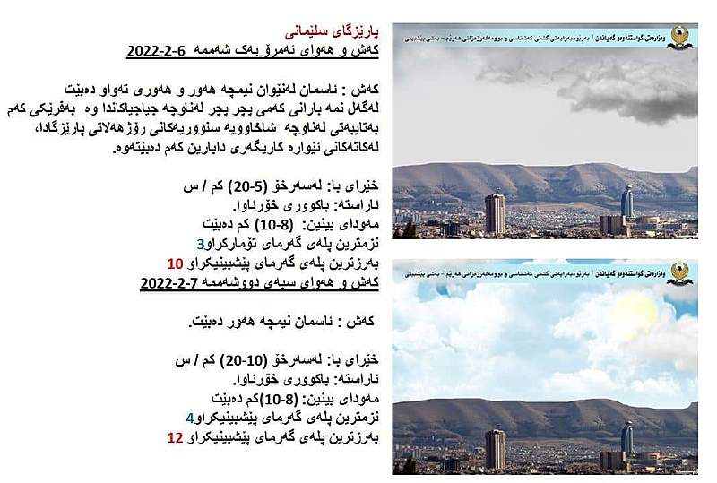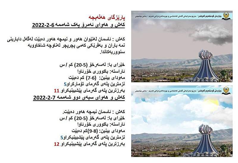 بهڕێوهبهرایهتیی گشتیی كهشناسی و بوومهلهرزهزانی ههرێمی کوردستان پێشبینییەکانی كهشوههوای ئهمڕۆ یەکشەممە 6ی شوبات و سبەینێ دووشەممە 7ی شوباتی 2022ی شارەکانی هەرێمی كوردستانی بڵاوكردهوه.