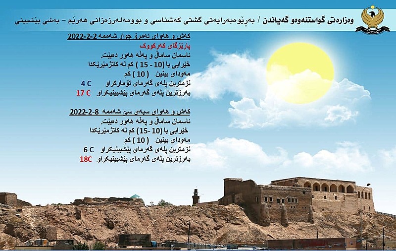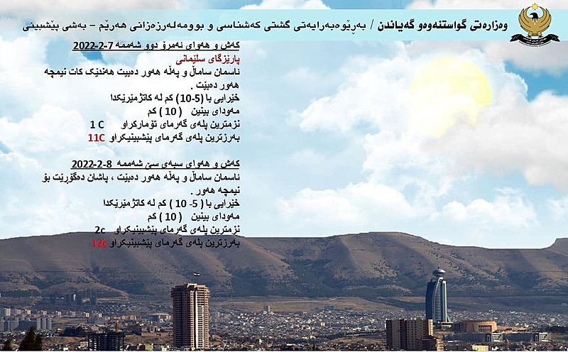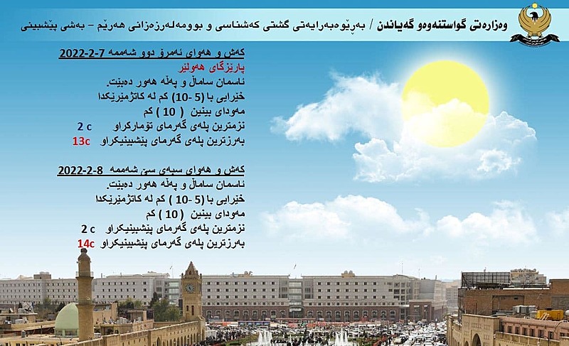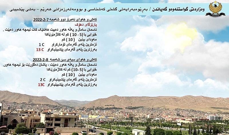 ئەمڕۆ دووشەممە حەوتی شووباتی 2022 لە راگەیەندراوێکدا بەرێوەبەرایەتیی گشتیی کەشناسی و بومەلەرزەزانی هەرێمی کوردستان ئاماژەی بەوەکرد "ئاسمان سماڵ و پەڵە هەور دەبێت و هەندێک کاتیش نیمچە هەور دەبێت".