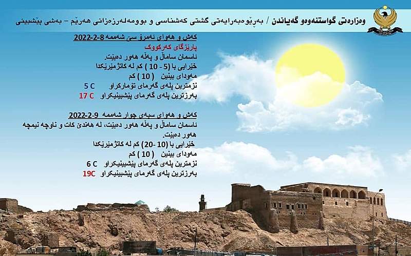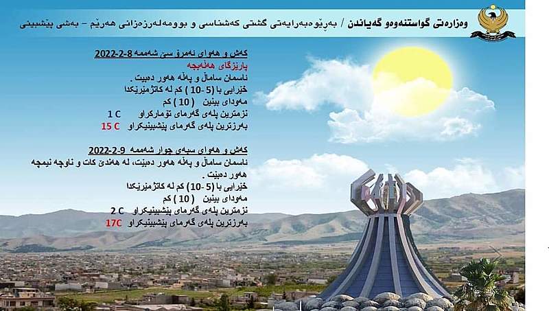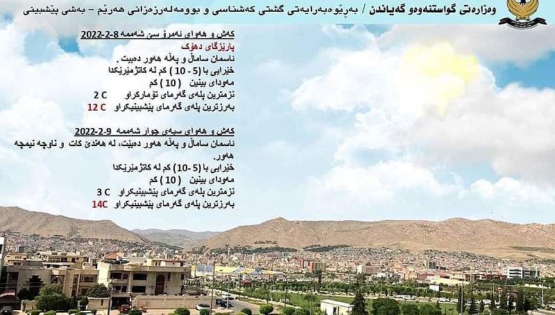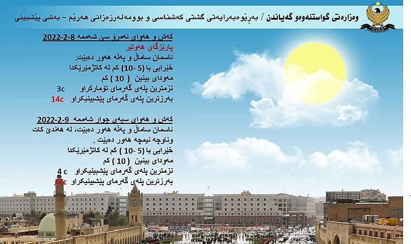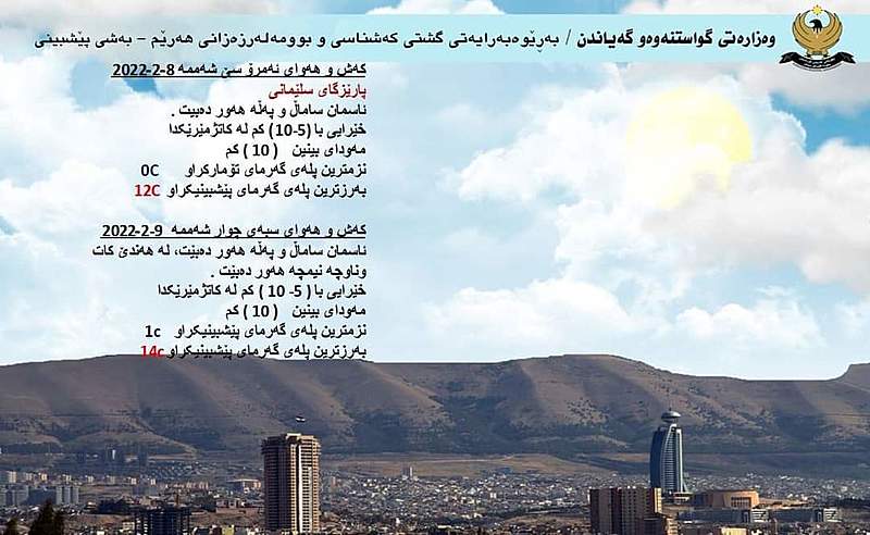 بهڕێوهبهرایهتیی گشتیی كهشناسی و بوومهلهرزهزانی ههرێمی کوردستان پێشبینییەکانی كهشوههوای ئهمڕۆ سێشەممە 8ی شوبات و سبەینێ چوارشەممە 9ی شوباتی 2022ی شارەکانی هەرێمی كوردستانی بڵاوكردهوه.