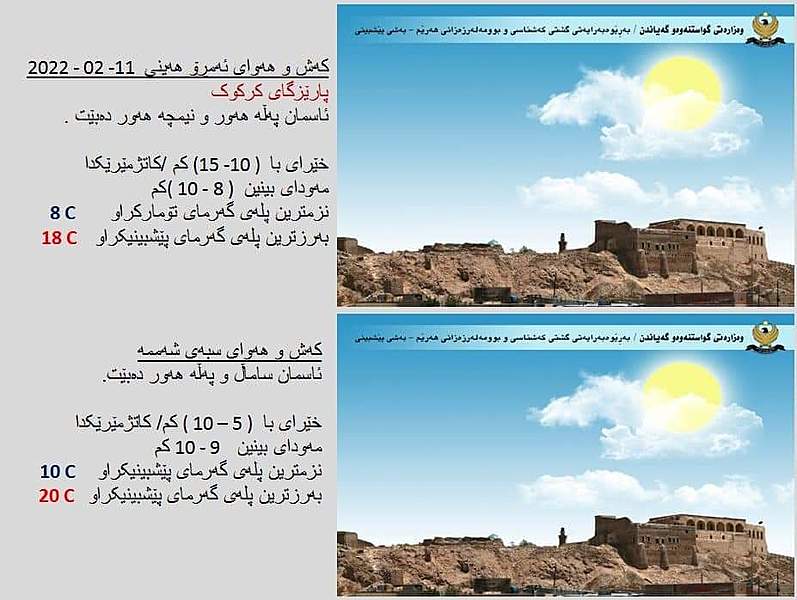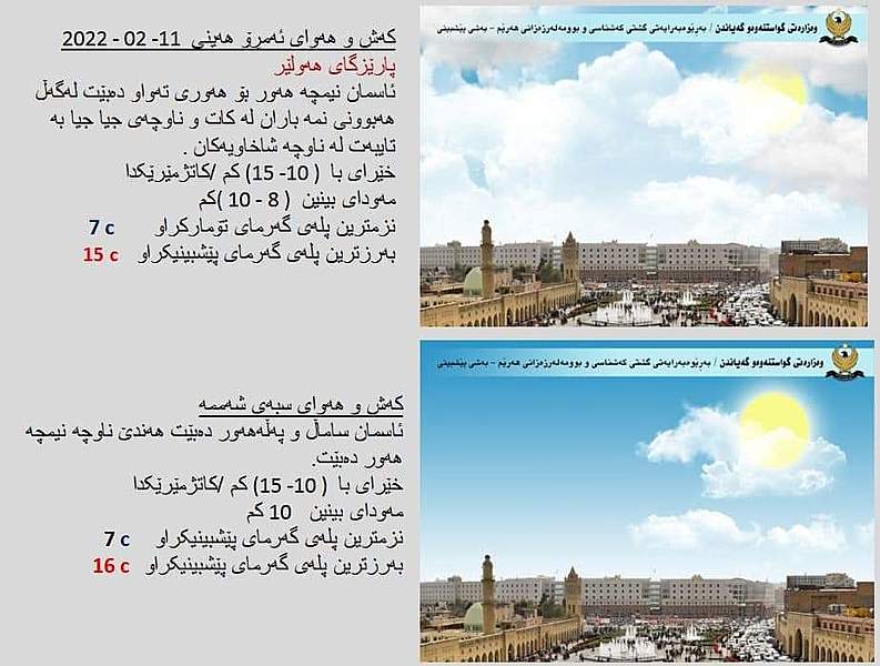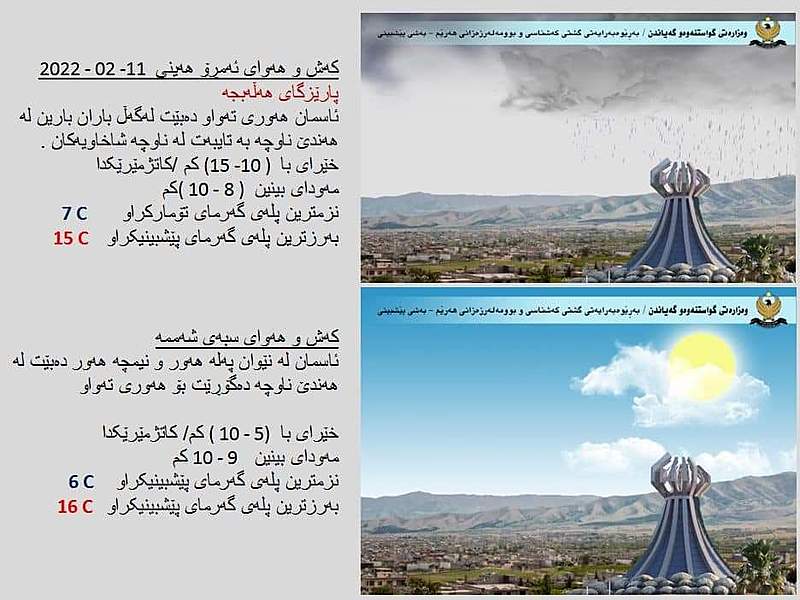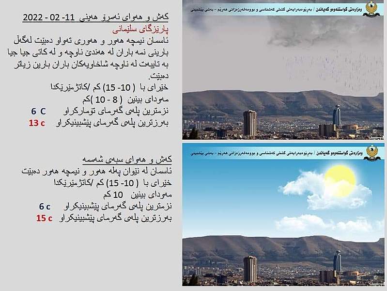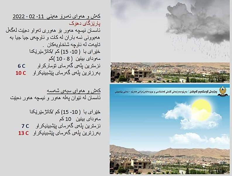 بهڕێوهبهرایهتیی گشتیی كهشناسی و بوومهلهرزهزانی ههرێمی کوردستان پێشبینییەکانی كهشوههوای ئهمڕۆ هەینی 11ی شوبات و سبەینێ شەممە 12ی شوباتی 2022ی شارەکانی هەرێمی كوردستانی بڵاوكردهوه.