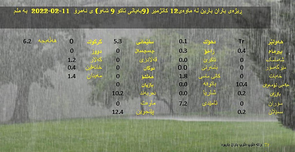 رێژەی باران بارینی 12 كاتژمێرى رابردووی ههندێك له ناوچهكانى ههرێم: