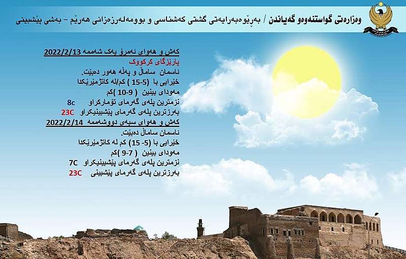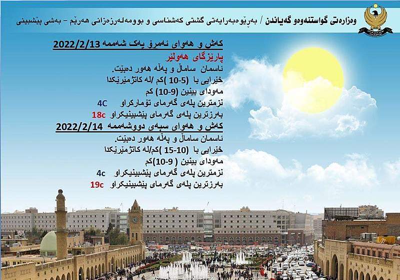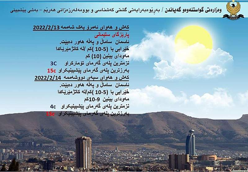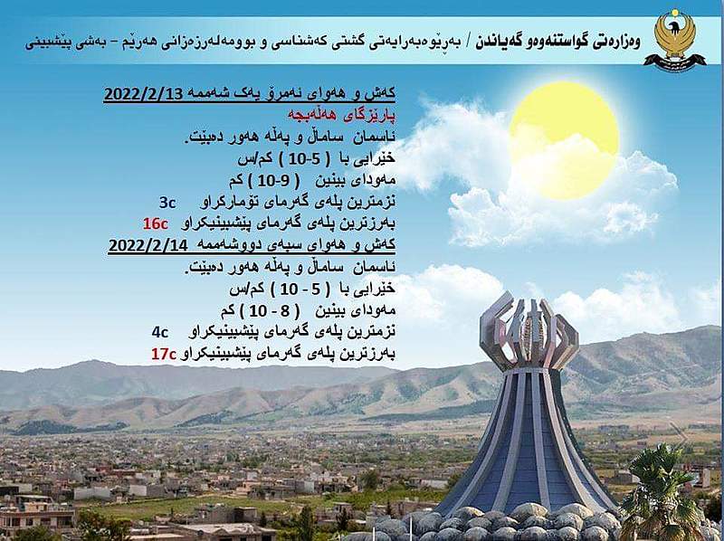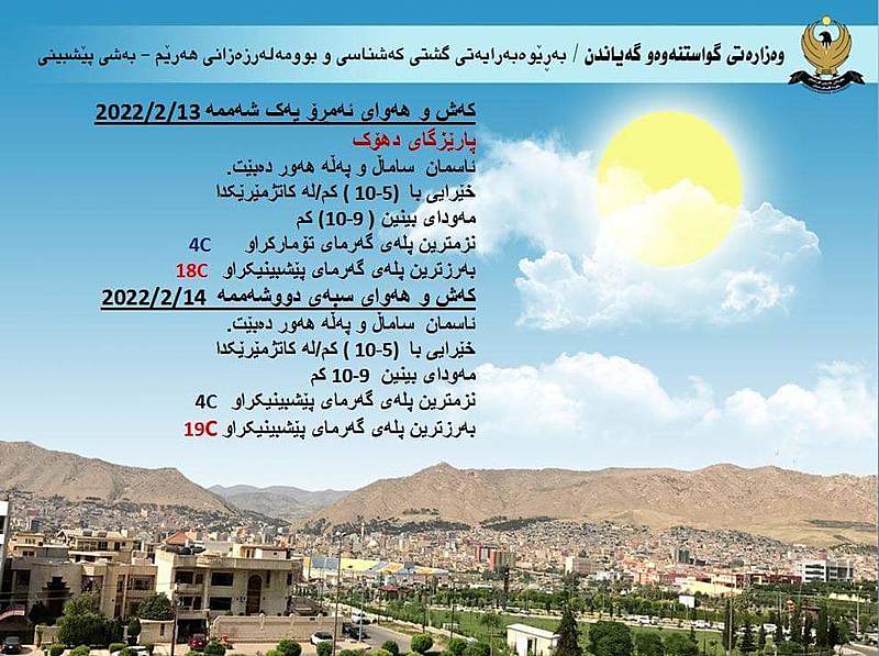 بهڕێوهبهرایهتیی گشتیی كهشناسی و بوومهلهرزهزانی ههرێمی کوردستان پێشبینییەکانی كهشوههوای ئهمڕۆ یەکشەممە 13ی شوبات و سبەینێ دووشەممە 14ی شوباتی 2022ی شارەکانی هەرێمی كوردستانی بڵاوكردهوه.