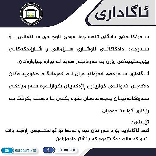 دادگای سلێمانی ئاگاداری سەرجەم فەرمانبەران دەکاتەوە