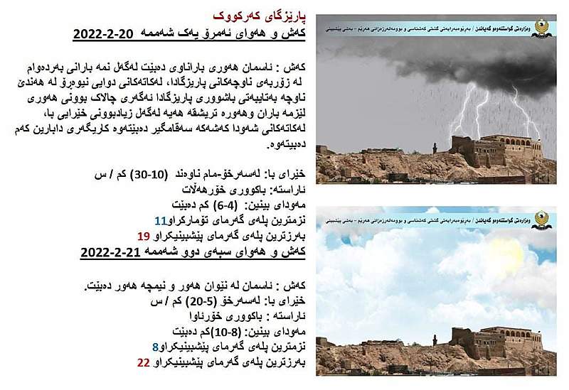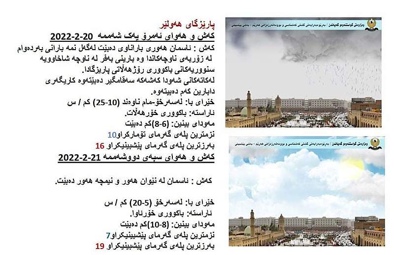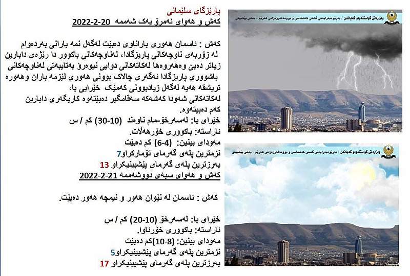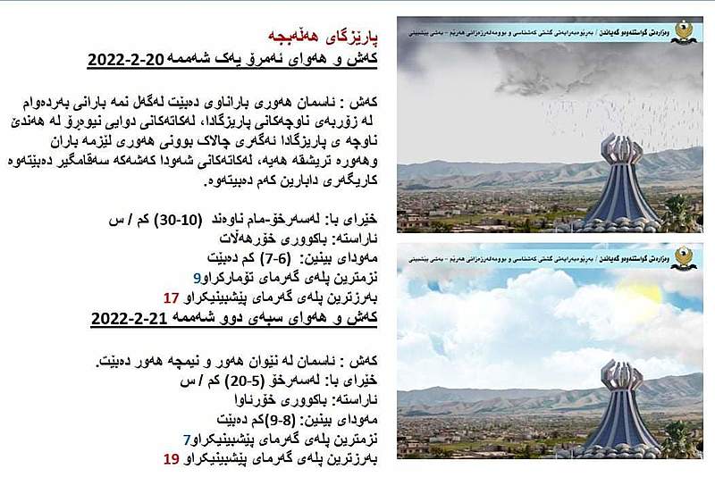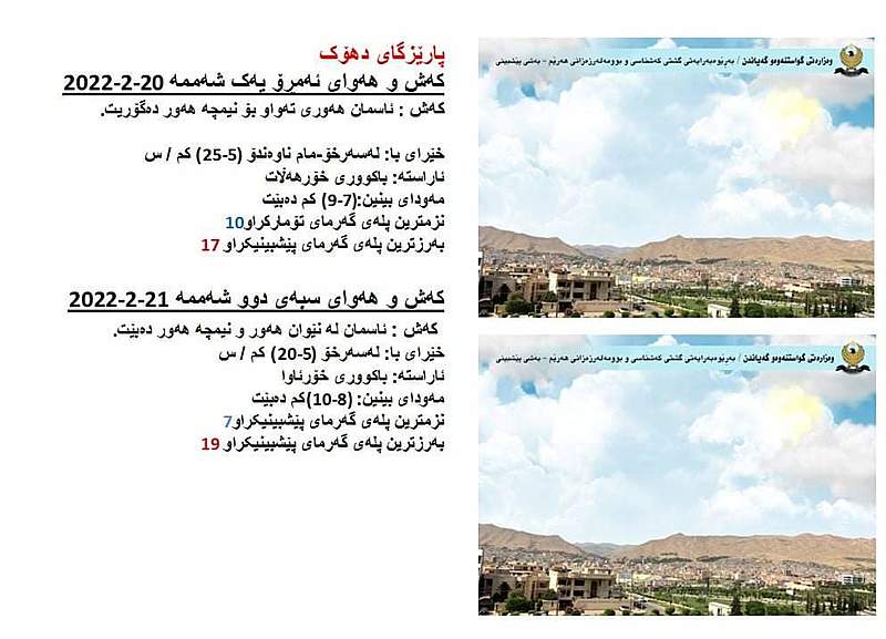 بهڕێوهبهرایهتیی گشتیی كهشناسی و بوومهلهرزهزانی ههرێمی کوردستان پێشبینییەکانی كهشوههوای ئهمڕۆ یەکشەممە 20ی شوبات و سبەینێ دووشەممە 21ی شوباتی 2022ی شارەکانی هەرێمی كوردستانی بڵاوكردهوه.