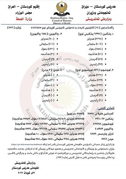 ئاماری نوێی تووشبوون بە کۆرۆنا لە هەرێمی کوردستان