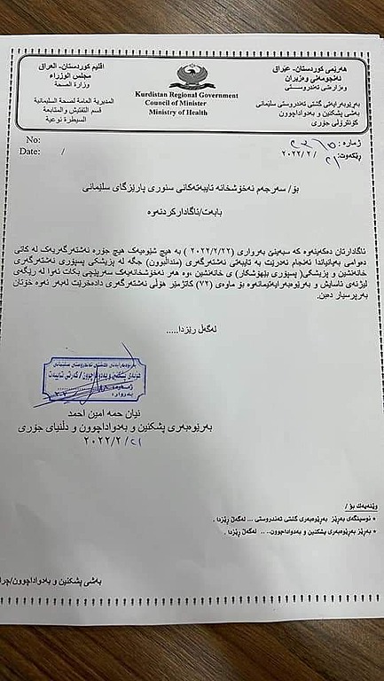 بەپێی نووسراوێکی بهشى پشكنین و بهدواداچوونى كۆنترۆڵى جۆریی بهڕێوهبهرایهتی گشتیی تهندروستى سلێمانى کە تیادا هاتووە "ئاگادارتان دهكهینهوه ئهمڕۆ 22ى شوباتى 2022 بههیچ شێوهیهك هیچ جۆره نهشتهرگهرییهك لهكاتى دهوامى بهیانیاندا ئهنجام نهدرێت به تایبهت نهشتهرگهریی منداڵبوون".