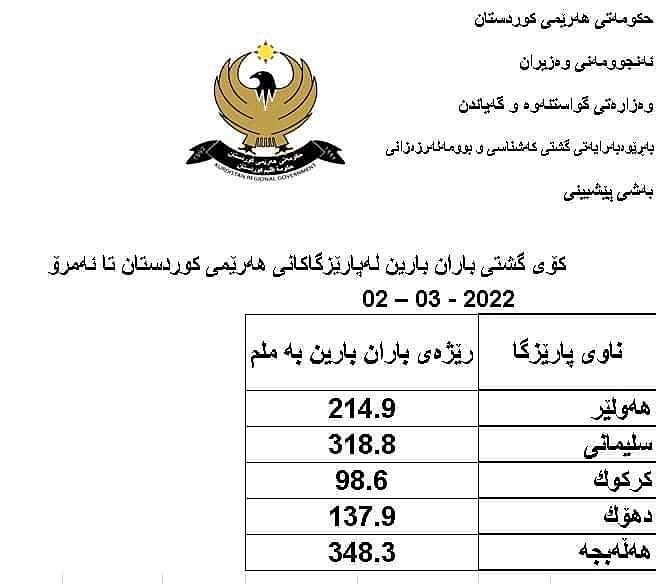بەڕێوەبەرایەتیی کەشناسی و بوومەلەرزەزانی هەرێمی کوردستان رێژەی باران بارینی ئەمساڵی شارەکانی کوردستانی بڵاوکردەوە، بەپێی ئەو رێژانە بێت لە پارێزگای هەڵەبجە زۆرترین باران بارییوە کە رێژەکەی 348.