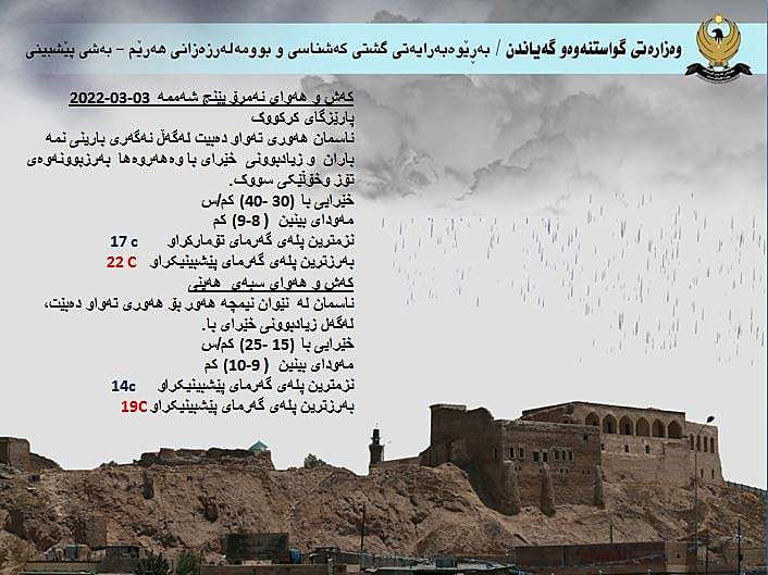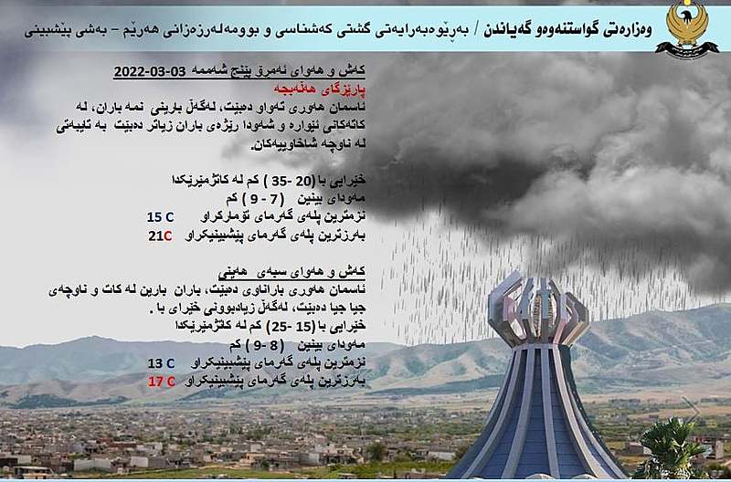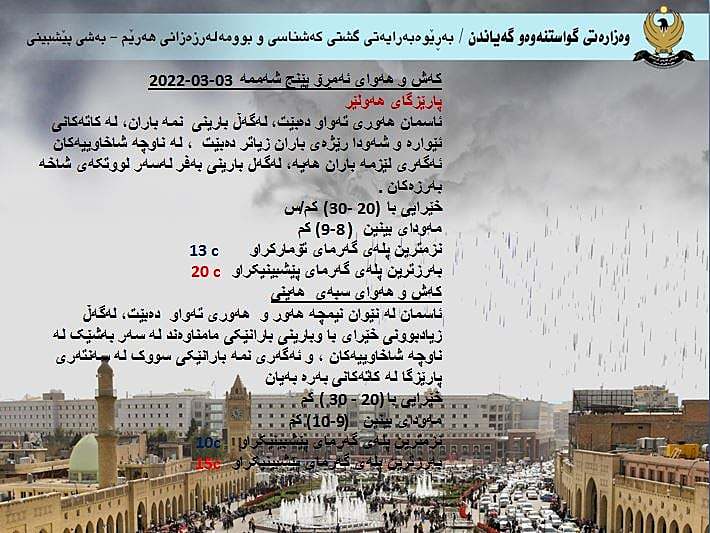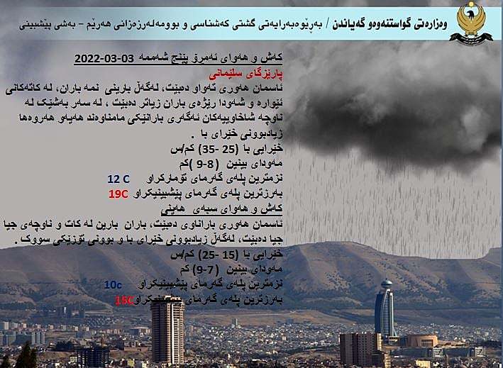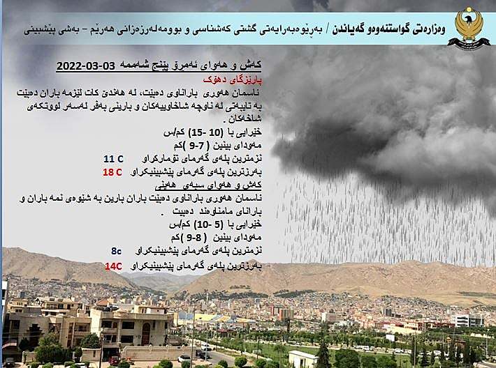 بەڕێوەبەرایەتیی کەشناسی و بومەلەرزەزانی هەرێمی کوردستان بڵاویکردەوە، ئەمڕۆ لەتەواوی پارێزگاکانی هەرێم، ئاسمان هەوری تەواودەبێت، باران بارین بە شێوەی پچڕ بەردەوام دەبێت، هاوکات خێرایی با زیاددەکات و تۆزێکی سوک بەرزدەبێتەوە، کەشوهەوای سبەینێش گۆڕانکاری ئەوتۆی بەسەردانایات و باران بارین بەشێوەی پچڕ پچڕ بەردەوام دەبێت.