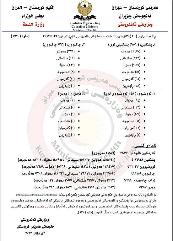 نوێترین ئامارەکانی کۆرۆنا لە هەرێمی کوردستان
