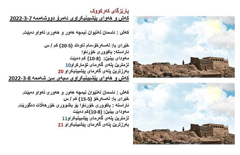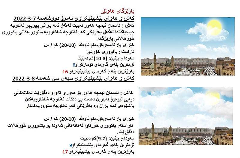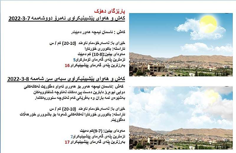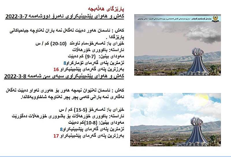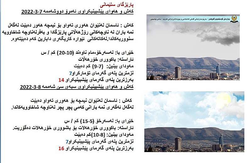 ئەمڕۆ دووشەممە بەڕێوەبەرایەتیی گشتیی کەشناسی هەرێمی کوردستان ئاماژەی بەوەکرد، ئەم شەپۆلی باران بارینە تا پاشنیوەڕۆی ئەمڕۆ بەردەوام دەبێت، لە ناوچە شاخاوییەکان و بەشێک لەشارەکانی هەرێم شەپۆلی باران بارین بەردەوامدەبێت و دواتریش ئاسمان هەور و نیمچەهەور دەبێت.