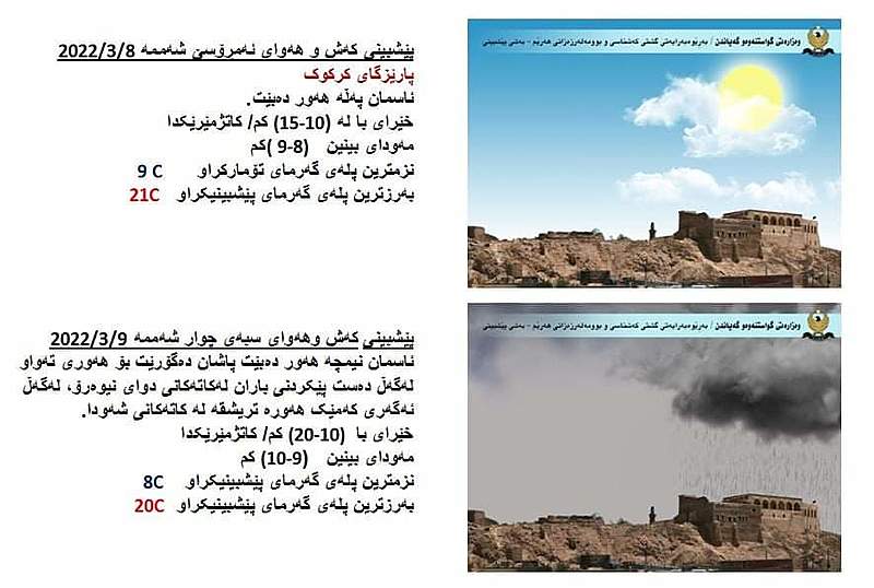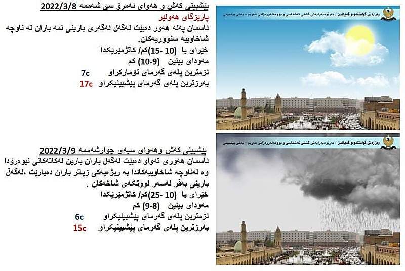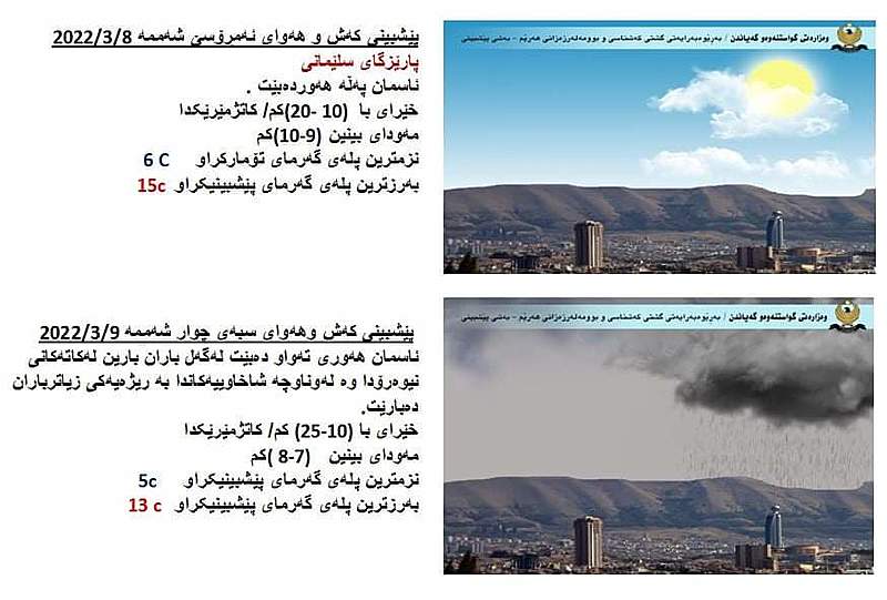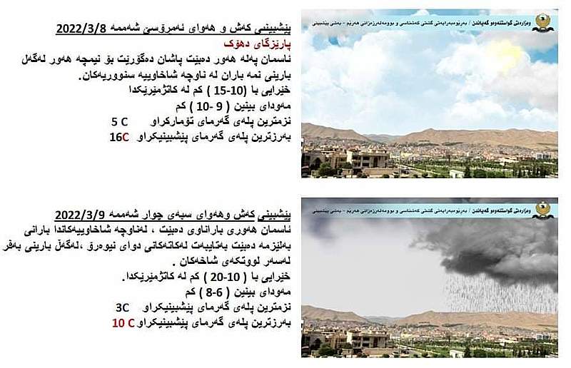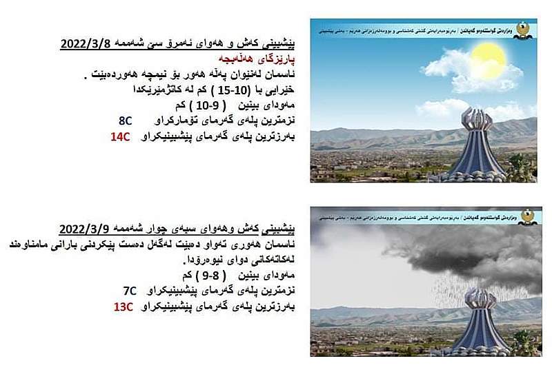 بهڕێوهبهرایهتیی گشتیی كهشناسی و بوومهلهرزهزانی ههرێمی کوردستان پێشبینییەکانی كهشوههوای ئهمڕۆ سێشەممە 8ی ئازار و سبەینێ چوارشەممە 9ی ئازاری 2022ی شارەکانی هەرێمی كوردستانی بڵاوكردهوه.