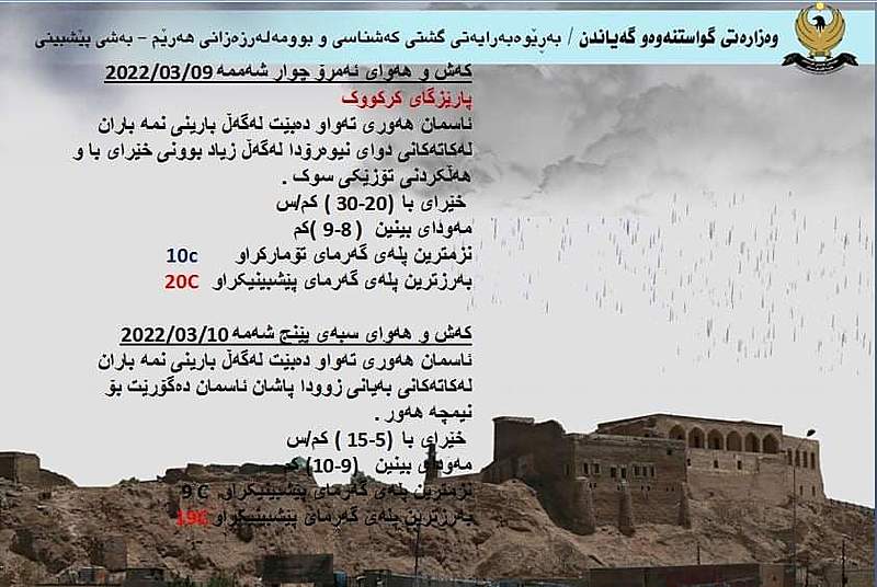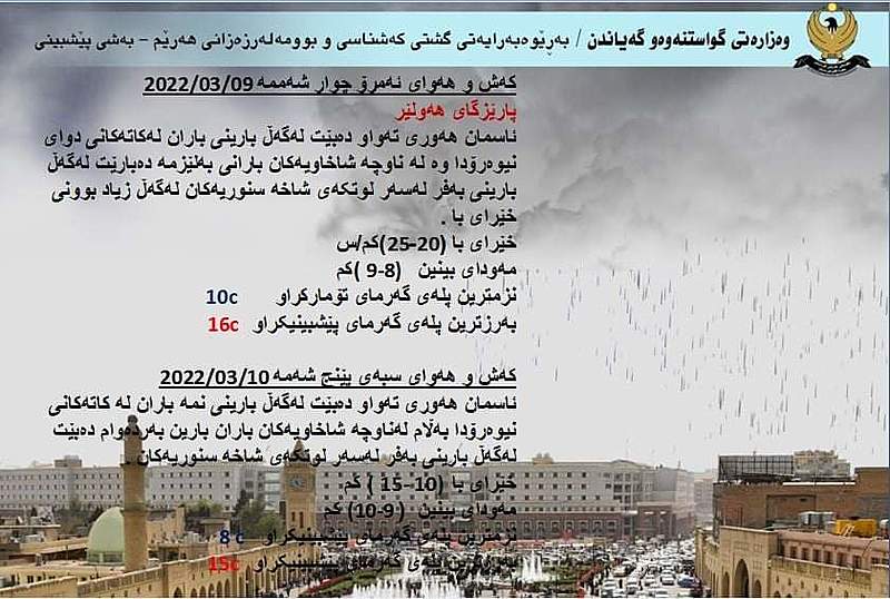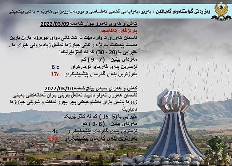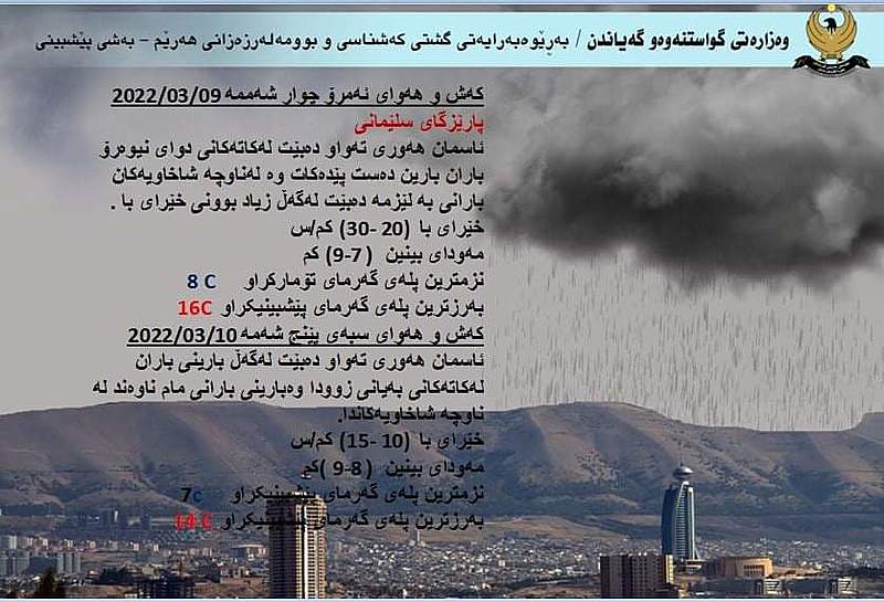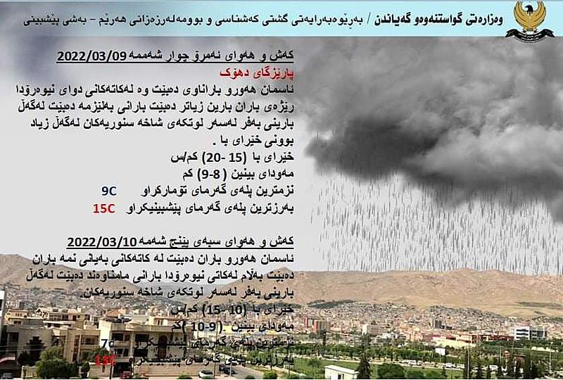 بهڕێوهبهرایهتیی گشتیی كهشناسی و بوومهلهرزهزانی ههرێمی کوردستان پێشبینییەکانی كهشوههوای ئهمڕۆ چوارشەممە 9ی ئازار و سبەینێ پێنجشەممە 10ی ئازاری 2022ی شارەکانی هەرێمی كوردستانی بڵاوكردهوه.