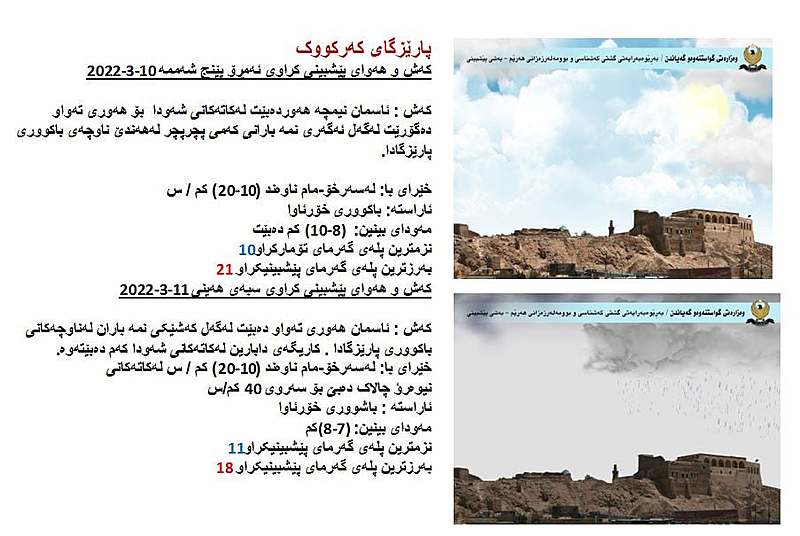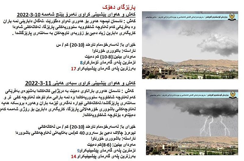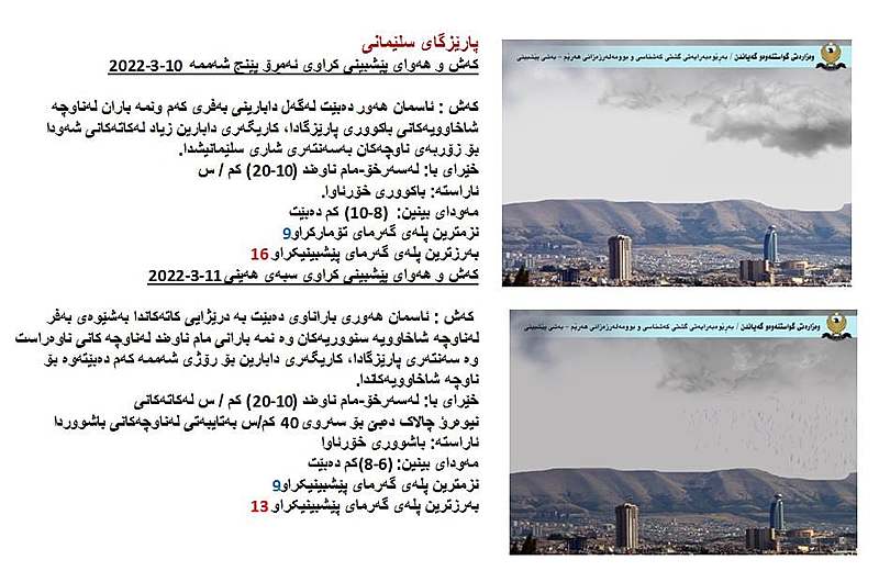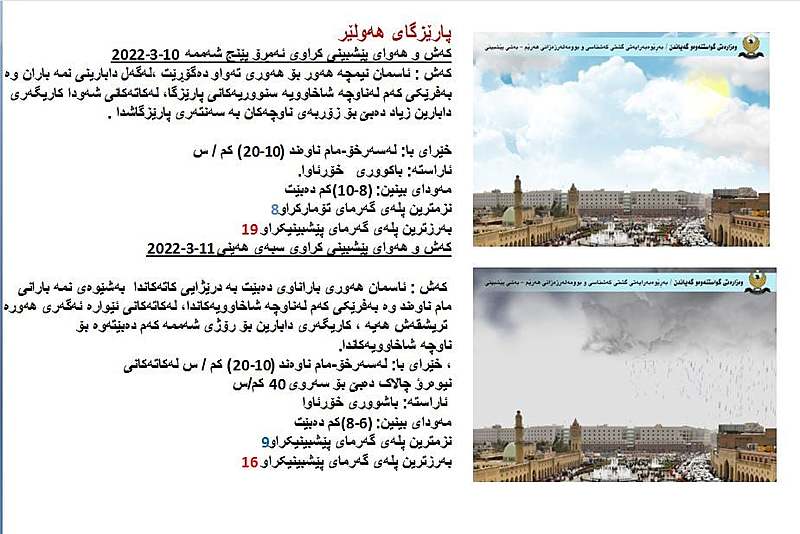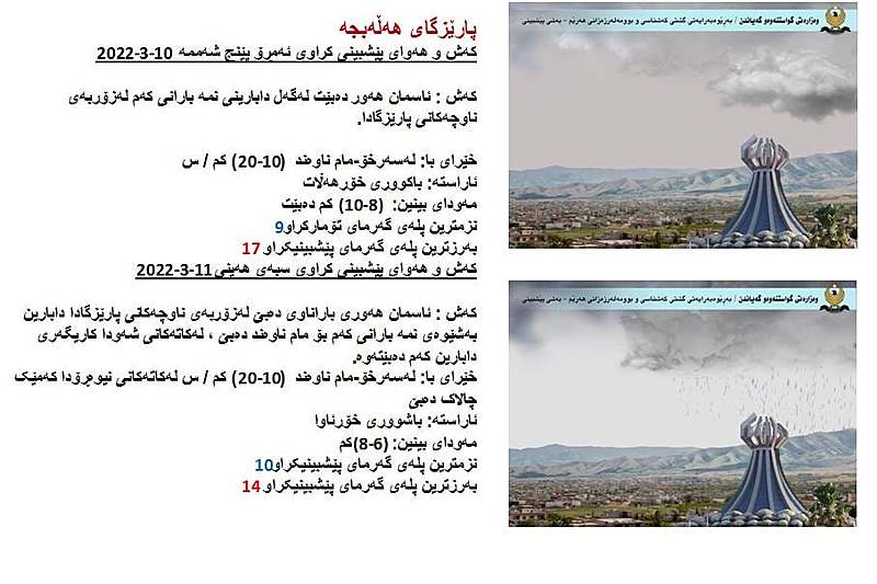 لە راگەیەندراوێکدا بهڕێوهبهرایهتیی گشتیی كهشناسی و بومهلهرزهزانی ههرێمی كوردستان ئاماژەی بەوەکرد، ئهمڕۆ پێنجشهممه ئاسمان نیمچه ههور و پاشان بۆ ههوری تهواو دهگۆڕێت، لهگهڵ دابارینی نمهباران و بهفرێكی كهم لهناوچه شاخاویه سنووریهكان، سبهینێ ههینیش ئاسمان ههوری باراناوی دهبێت لهزۆربهی ناوچهكان دابارین بهشێوهی نمهبارانی كهم بۆ مامناوهند دهبێت.
