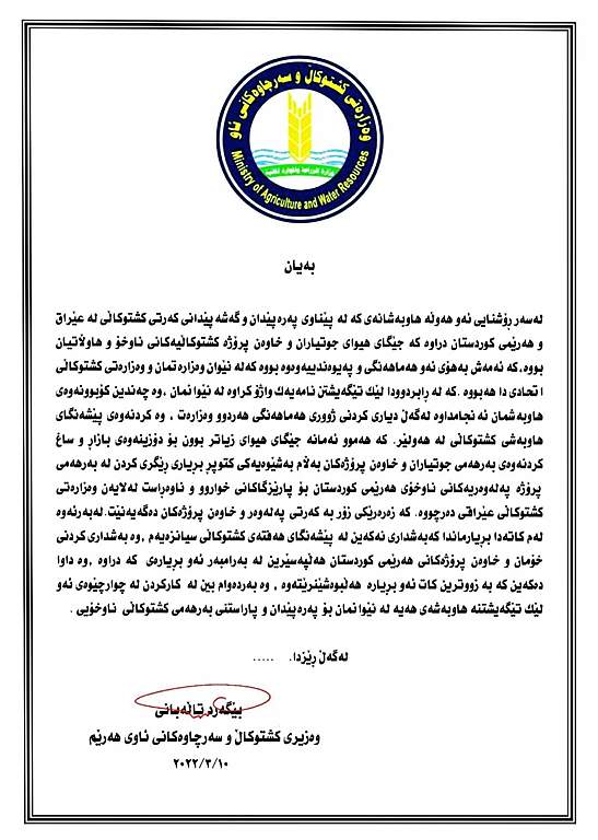 وەزیری کشتوکاڵ و سەرچاوەکانی ئاوی حکومەتی هەرێمی کوردستان لەبارەی بڕیارێکی وەزارەتی کشتوکاڵی عیراق راگەیەندراوێکی بڵاوکردەوە دوای راگرتنی ئەو بڕیارە دەکات.