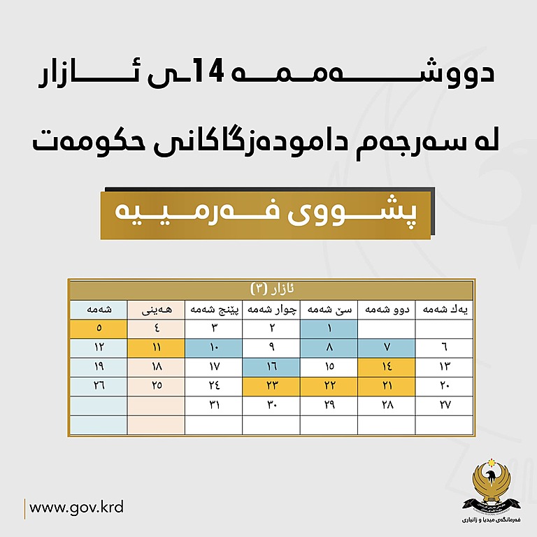 پێشتریش لە راگەیەندراوێک جوتیار عادل، وتەبێژی حکومەتی هەرێمی کوردستان سەبارەت بە پشووەکانی جەژنی نەتەوەیی نەورۆزەوە رایگەیاند، بۆ ماوەی چوار رۆژ پشوو دەبێت.
