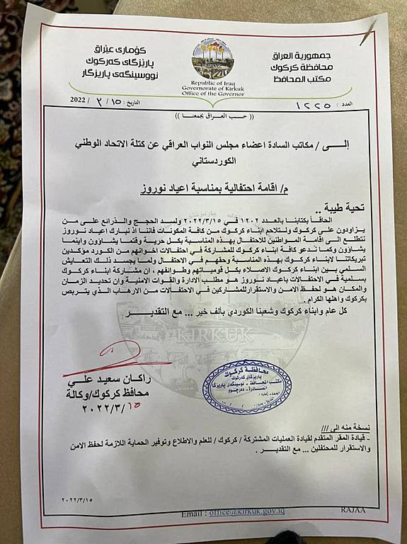 پارێزگاری کەرکوک بە وەکالەت ئەمڕۆ لە نووسراوێکی فەرمیدا تەنها سێ کاتژمێری بۆ کوردەکان دیاریکردبوو بۆ یادکردنەوەی جەژنی نەورۆز لە پارێزگای کەرکوک، بەڵام بەهۆی کاردانەوەکان لەو نووسراوە پاشگەزبووەوە.