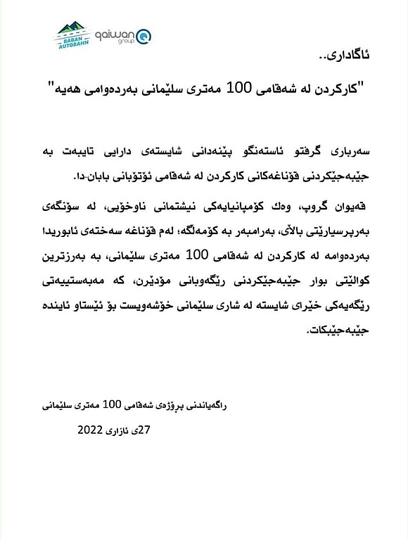 راگەیاندنی پڕۆژەی شەقامی 100 مەتری سلێمانی ئاماژە بەوەدەکات، كاركردن لە پڕۆژەکە بەردەوامی هەیە و رانەگیراوە.