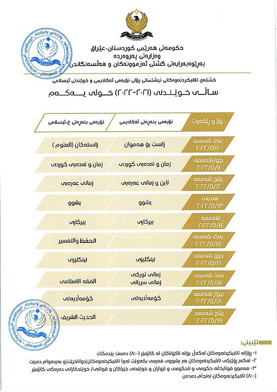 وەزارەتی پەروەردەی حکومەتی هەرێمی کوردستان خشتەی تاقیکردنەوەکانی نیشتمانی پۆلی نۆیەمی بنەڕەتی بۆ خوێندنی ساڵی (2021 - 2022) بڵاوکردەوە.