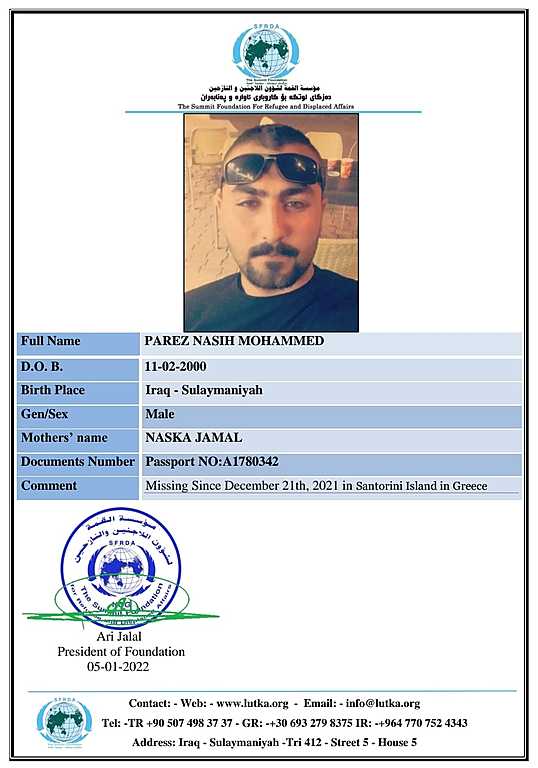 شێخ حسێن حەمە ساڵح، نوێنەری دەزگای لوتکە بۆ کاروباری ئاوارە و پەنابەران لە وڵاتی یونان رایگەیاند، دوای زیاتر لە سێ مانگ بەسەر رووداوی ژێرئاوکەوتنی یەختێکی کۆچبەران لە نزیک دورگەی سانتۆرینی یۆنانی، بەیانی ئەمڕۆ ئاگادار کراینەوە لە دۆزینەوەی تەرمێکی یەکێک لەو کۆچبەرە کوردانەی لە دەزگای لوتکە تۆمارکرابوون بەناوی پارێز ناسیح محەمەدی تەمەن 22 ساڵ.
