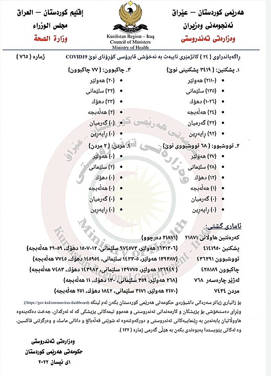 ئەمڕۆ هەینی 1ی نیسانی 2022 وەزارەتی تەندروستیی هەرێمی کوردستان رایگەیاند، لە 24 کاتژمێری رابردوودا 68 تووشبووی نوێ تۆمارکراون و 2 تووشبووش گیانی لەدەستداوە, هاوکات ئاماژەی بۆ ئەوەشكردووە، لە 24 کاتژمێری رابردوودا 77 تووشبووی كۆرۆنا چاكبوونهتهوه.