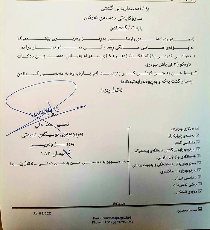 ئەمڕۆ یەکشەممە، وەزارەتی پێشمەرگەی حکومەتی هەرێمی کوردستان لە نووسراوێکیدا کە وێنەیەکی دەست مەودا میدیا کەوتووە هاتووە، لەسەر بڕیاری زارەکی شۆڕش ئیسماعیل، وەزیری پێشمەرگە، بەبۆنەی هاتنی مانگی رەمەزانی پیرۆز، دەوامی فەرمی وەزارەتی پێشمەرگە رۆژانە کاتژمێر (9:00) دەستپێدەکات و کاتژمێر (2:00) نیوەڕۆ کۆتایی دەبێت.