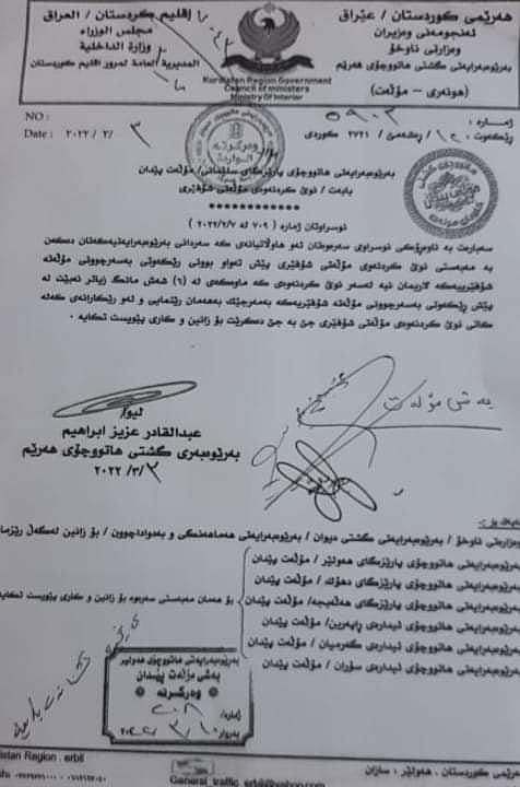 فازڵ حاجی، وتەبێژی هاتوچۆی هەولێر بە مەودا میدیای راگەیاند "بەپێی نووسراوێکی بەڕێوەبەرایەتیی گشتیی هاتوچۆی هەرێمی کوردستان بۆ لەمەودوا هاوڵاتییان و شوفێران بەر لە تەواوبوونی ماوەی بە سەرچوونی مۆڵەتەکانیان بە ماوەی شەش مانگ دەتوانن تازەی بکەنەوە".