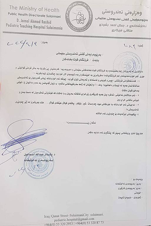 وەک لە نووسراوەکەدا هاتووە بەڕێوەبەری نەخۆشخانەی منداڵان داوایکردووە، لە بری ئەو خواردنانە، جۆرەکانی میوە و چەرەسات و شیر و نۆکاو و پاقلەی کوڵاو و ھێلکەی کوڵاو و چەند بابەتێکی دیکر بفرۆشرێن، ئەوەش لە ژێر چاودێری تەندروستیدا.