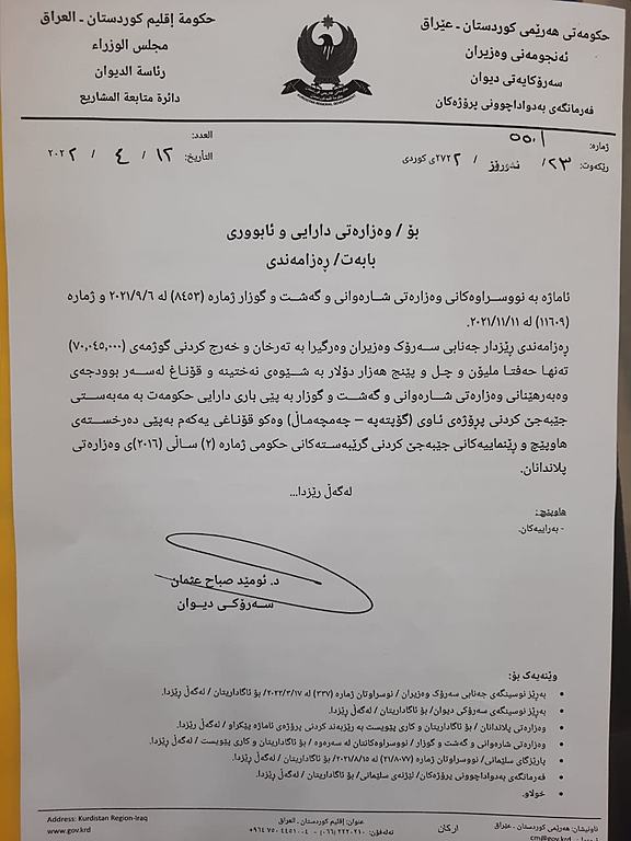 ئەمڕۆ سێشەممە 12ی نیسانی 2022 حکومەتی هەرێمی کوردستان بڕیاریدا بە خەرجکردنی بڕی حەفتا ملیۆن و 45 هەزار دۆلار بۆ جێبەجێکردنی قۆناغی یەکەمی پرۆژەی ئاوی (گۆپتەپە - چەمچەماڵ).