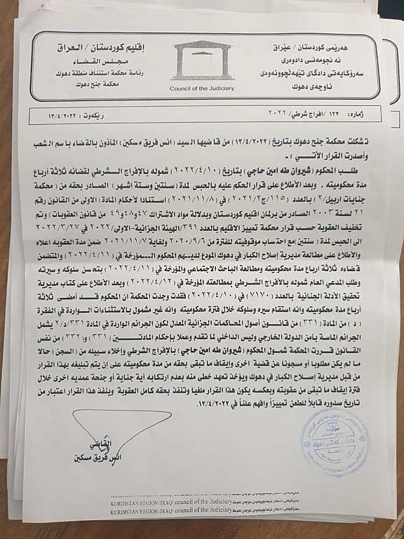 بەڵام دوای ساڵێک و شەش مانگـ لە بەندکردنیان، ئەمڕۆ لە دانیشتنێکی تایبەتدا دادگەی تێھەڵچوونەوەی ناوچەی دھۆک بڕیاریدا بە ئازادکردنی ھەردوو چالاکوانەکە.