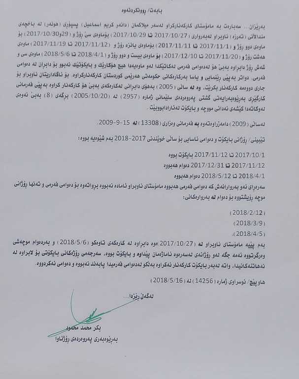 پەروەردەى رۆژئاواى سلێمانى رایگەیاند، ئەو مامۆستایەى دەوترێت بەهۆى بایکۆتەوە دورخراوەتەوە، بەو هۆکارە نەبووە، بەڵکو بەهۆى "پابەندنەبوونى بووە" بەدەوامى فەرمى.