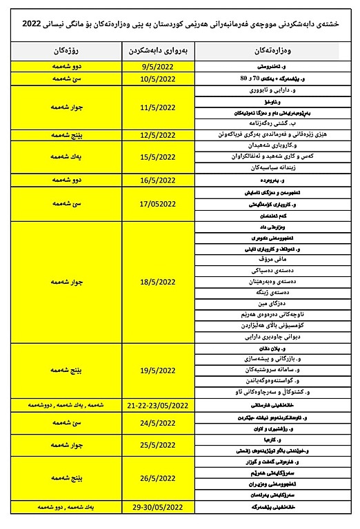 بەپێی خشتەکە بێت سبەینێ دووشەممە 9ی ئایاری 2022 دابەشکردنی مووچە دەستپێدەکات و یەکەم وەزارەت کە مووچە وەردەگرێت وەزارەرتی تەندروستییە، هەروەها دابەشکردنی مووچە بەردەوامی دەبێت تاوەکو 30ی ئایاری 2022 کۆتا شوێنیش خانەنشینی پێشمەرگە مووچە وەردەگرن.