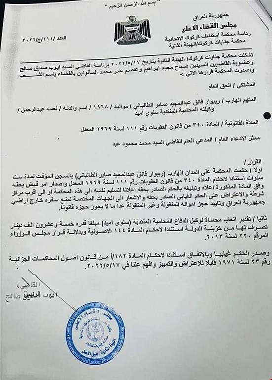 بڕیارەكەی دادگەی كەركوك بەپێی مادەی (340) ی یاسای سزادانی عیراقییە كە لەو مادەیەدا ئاماژە بەوەكراوە، هەر كەسێك بە كارێكی حكومی راسپێردرا بوو زیانی بە دامودەزگاكانی حكومەت گەیاند زیندانی دەكرێت كە لە حەوت ساڵ زیاتر نەبێت.