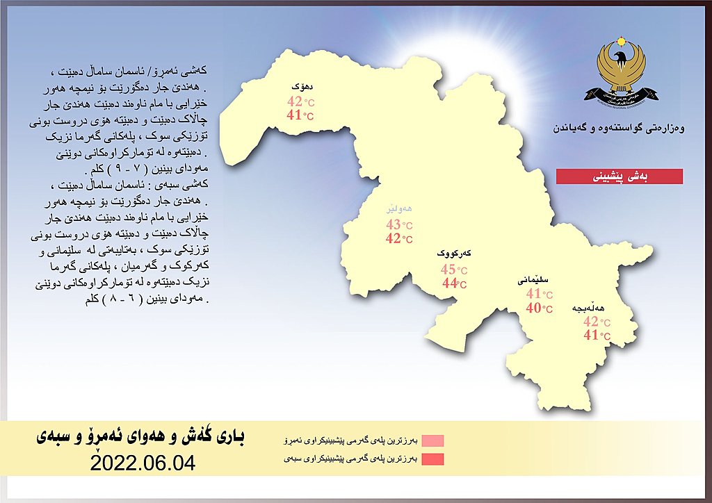 بەڕێوەبەرایەتیی گشتیی کەشناسی و بومەلەرزەزانی هەرێمی کوردستان رایدەگەیەنێت، ئەمڕۆ ئاسمانی شارەکان بەگشتی ساماڵ دەبێت و دواتر دەگۆڕێت بۆ نیمچە هەور، خێرایی باش مامناوەند دەبێت و ئەگەری دروستبوونی تۆز و خۆڵێکی سوکیش هەیە و پلەکانی گەرماش وەک دوێنێ دەبن.