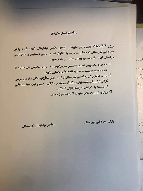 دوای کۆبوونەوەی ئەمڕۆ سێشەممە 7ی حوزەیرانی 2022 هەردوو دەزگای هەڵبژاردنی یەکێتی و پارتی لە راگەیەندراوێکی هاوبەشدا رایانگەیاند "هەردوولا هاوڕابوون لەسەر پێویستی نووسینەوەی دەستووری هەرێمی کوردستان بۆ ئەم مەبەستە پێویستە دەست بە ئامادەکاریی یاسایی بکرێت".