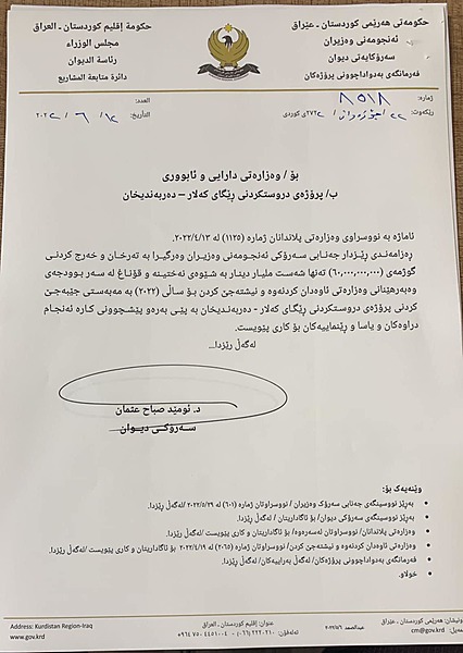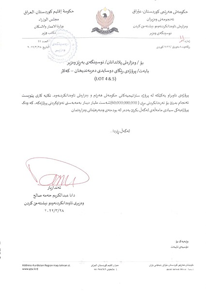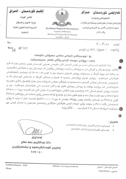 ئهمڕۆ دووشهممه وەزارەتی ئاوەدانکردنەوە و نیشتەجێکردنی حکومەتی هەرێمی کوردستان بڵاویكردهوه، بەفەرمانی مەسرور بارزانی، سەرۆکی ئەنجومەنی وەزیران، سەرۆکایەتیی دیوانی ئەنجومەنی وەزیران لە رۆژی 12-6-2022 نووسراوی ئاراستەی وەزارەتی دارایی و ئابووری کردوە و تیایدا رەزامەندی دەربڕیوە لەسەر تەرخانکردنی بڕی 60 ملیار دینار بە مەبەستی جێبەجێکردنی دروستکردنی رێگەی کەلار-دەربەندیخان.