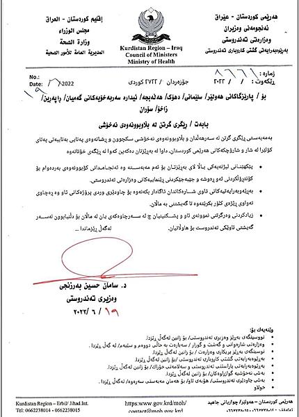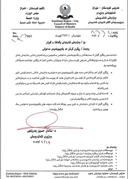 بە مەبەستی رێگریکردنی لە پەتای سکچون، رشانە و کۆلێرا وەزارەتی تەندروستی ھەرێمی کوردستان دوو نووسراو ئاڕستەی پارێزگا و ئیدارە سەربەخۆکان و وەزارەتی شارەوانی و گەشتوگوزار کرد.
