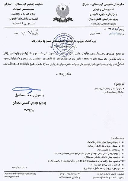 لە راگەیەندراوێکدا کە وێنەیەکی دەست مەودا میدیا کەوتووە هاتووە "هاوپێچ خشتەی پەسەندکراوی وەزارەتی پلاندانان بەمەبەستی خوێندنی ماستەر و دکتۆرا بۆ وەزارەتمان بۆتان رەوانە دەکەین، پێویستە تاکو 31/7/2022 ناوی ئەو فەرمانبەرانەی کە ئارەزوی خوێندنی ماستەر و دکتۆرایان هەیە، لەگەڵ ئەو پێداویستیانەی خوارەوە بۆمان دابین بکەن، دوای بەرواری ئاماژە پێکراو هیچ داواکارییەک وەرناگیرێت".