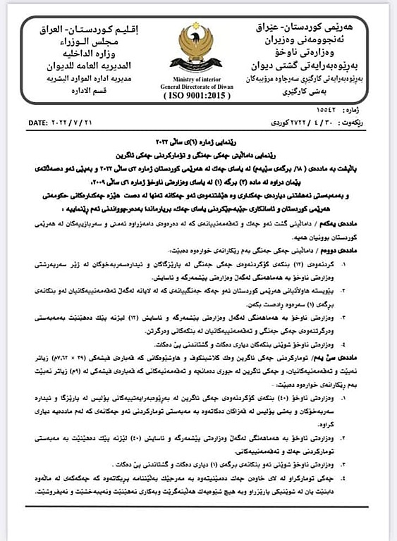 وهزارهتى ناوخۆ چهند رێنماییهكى تایبهت به پێدانى مۆڵهتى چهك بڵاوكردووەتهوه و ئاماژهى بهچهند خاڵێك كردووه لهوانه، مۆڵهتى ههڵگرتن و نوێكردنهوهى چهكى ئاگرین تفاقی، بهپێى مادهى پێنج له یاساى چهك، دهدرێت به هاوڵاتییانى دانیشتووى ههرێمی كوردستان.