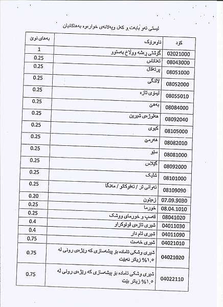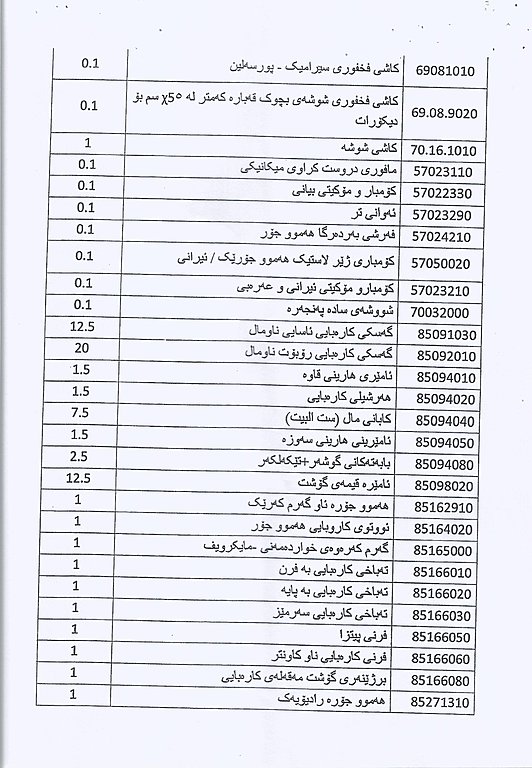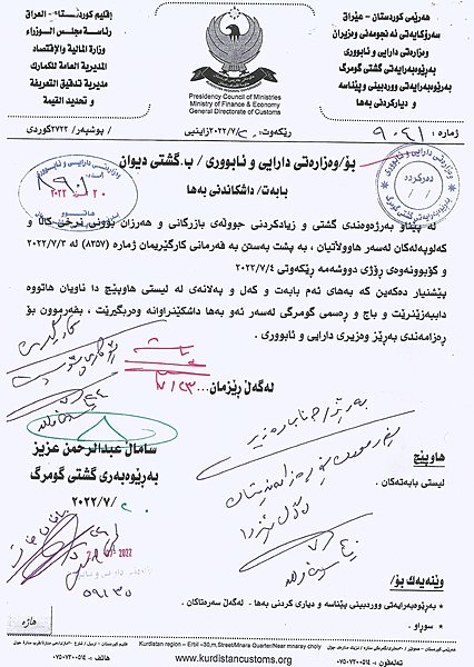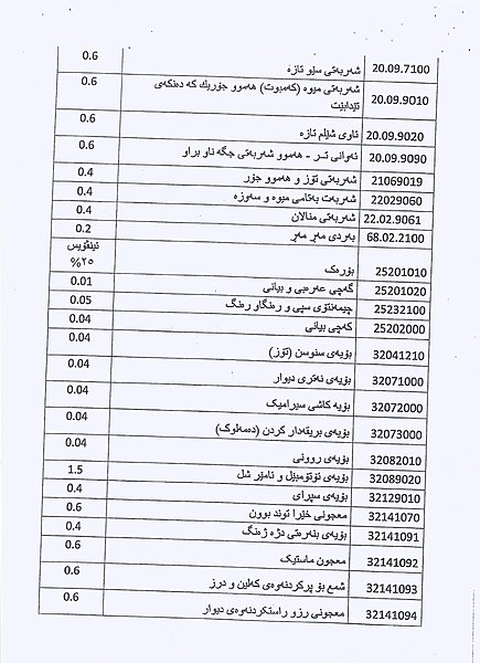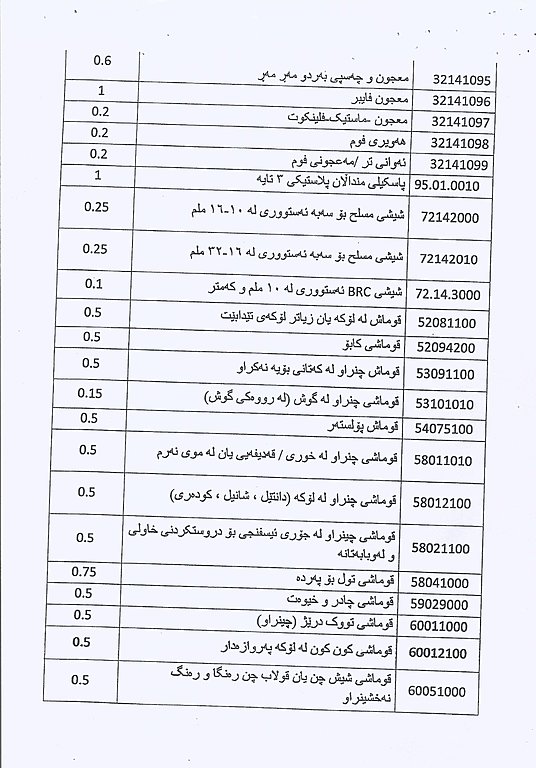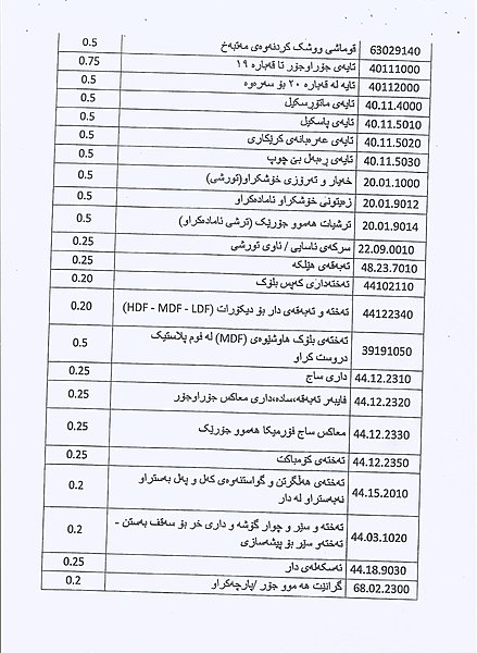 وهزارهتی دارایی و ئابووری حكومهتی ههرێمی كوردستان بڕیاریدرا به چاوخشاندنهوه و كهمكردنهوهی بههاو رهسمی گومركی بۆ بابهتهكانی خواردن و بیناسازی و كاڵاكانی بهكاربردنی رۆژانه كه بریتین له 171 كاڵای جۆراوجۆر.