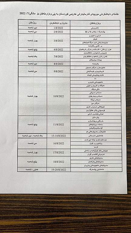 ئەمڕۆ دووشەممە سەرچاوەیەک لە وەزارەتی دارای و ئابووریی حکومەتی هەرێمی کوردستانی بە مەودا میدیای راگەیاند، ئەمڕۆ دەست بە دابەشکردنی مووچەی مانگی تەمموز دەکرێت و بە دابەشکردنی مووچەی وەزارەتی تەندروستی دەستپێدەکات.