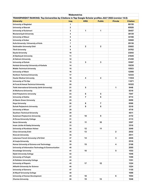 جارێکی دیکە لەسەر ئاستی کوردستان زانکۆی سلێمانی پلەی یەکەمی گرتەوە و لەسەر ئاستی زانکۆکانی عیراقیش پلەی سێیەمی وەرگرتووە، ئەوەش بەپێی ریزبەندی بڵاوکەراوەی (وێبۆمەتریک).