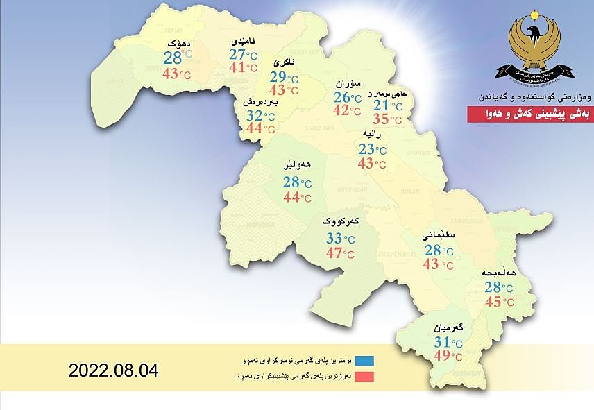 بەڕێوەبەرایەتیی گشتیی کەشناسی و بوومەلەرزەزانی هەرێمی کوردستان پێشبینییەکانی کەشوهەوای ئەمڕۆ پێنجشەممە چواری ئابی 2022ی شارەکانی هەرێمی کوردستانی بڵاوکردەوە.
