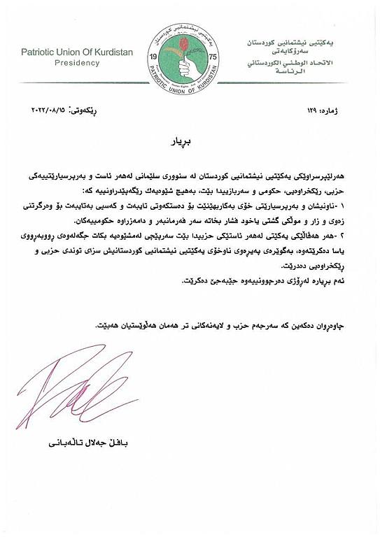 بافڵ جهلال تاڵهبانی، سهرۆكی یهكێتیی نیشتیمانی کوردستان له بڕیارێكدا كه ئاراستهی بهرپرسانی حزبی و سهربازی حزبهكهی كردوه و هۆشداری داونهتێ لهوهی، ههركهسێك بهرپرسیارێتی خۆی بهكاربهێنێت بۆ دهستكهوتی تایبهت و وهرگرتنی زهوی و زار و موڵكی گشتی رووبهڕووی یاسا دهكرێتهوه و بهگوێرهی پهیڕهوی ناوخۆی یهكێتیش سزای توند دهدرێت.